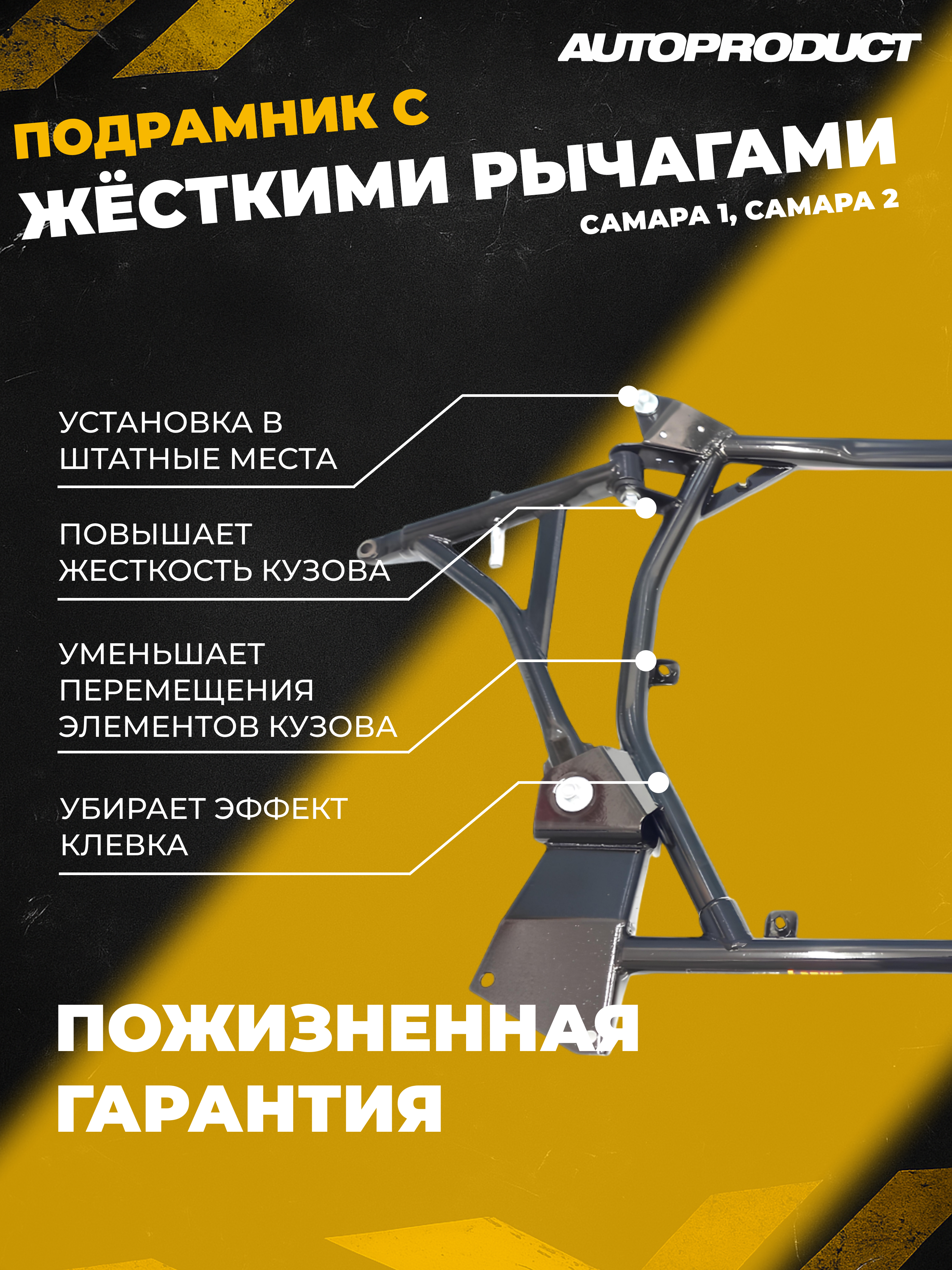 Подрамник ставится прямо в штатные места. Кузов становится жестче, подвеска работает правильнее, нагрузки распределяются равномерно. Машина меньше гуляет на неровностях и четко реагирует на руль. Управление становится точным, а кузовные элементы служат дольше.