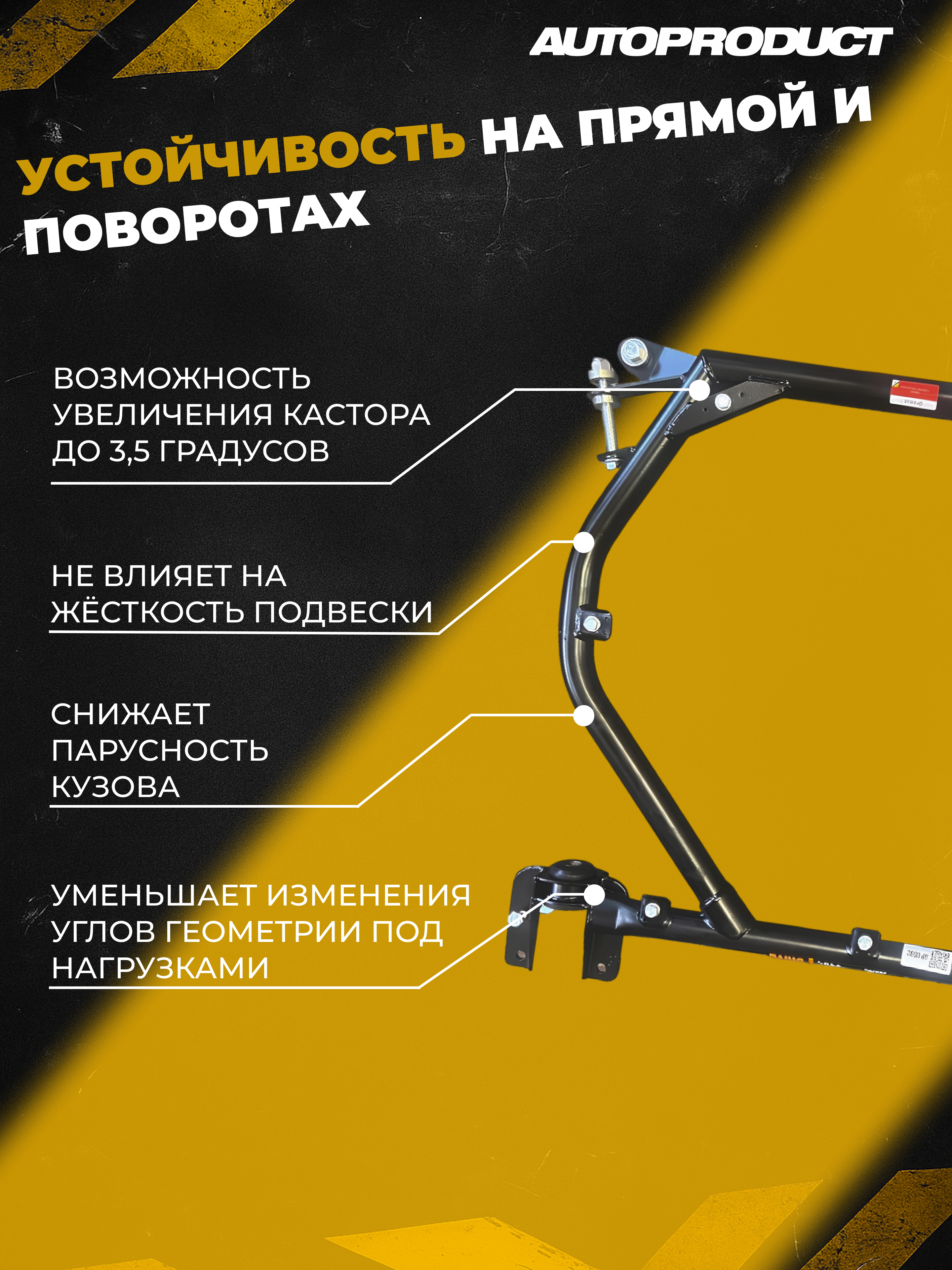 Подрамник позволяет увеличить угол кастора до 3,5 градусов или выровнять его на каждом колесе. Это улучшает устойчивость как на прямых, так и в поворотах, помогает рулю быстрее возвращаться в ноль после маневров и делает управление на скорости легче. Машина слушается лучше и не требует держать руль изо всех сил.